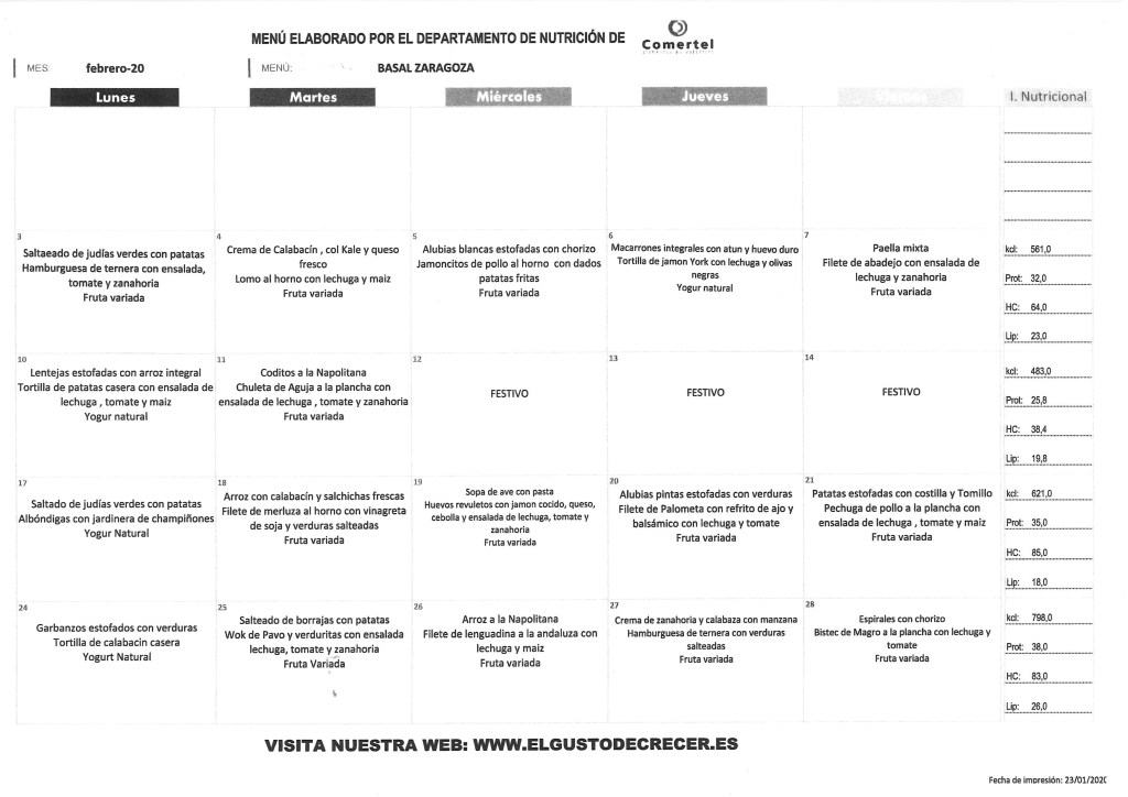03/02/2020 Colegio Público "El Parque" Huesca Menú de febrero 2020 Comparte:Tweet Haz clic para enviar un enlace por correo electrónico a un amigo (Se abre en una ventana nueva) Correo electrónico Haz clic para imprimir (Se abre en una ventana nueva) Imprimir Me gusta Cargando...