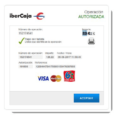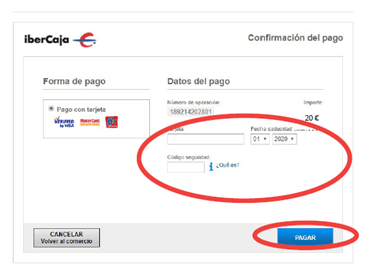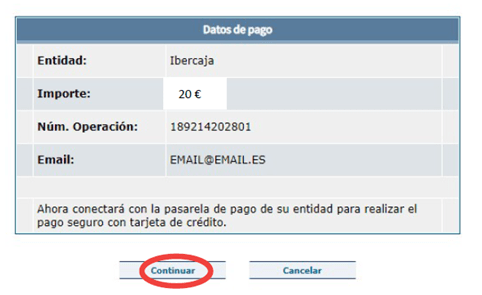 El botón “Continuar” conectará con la TPV de la entidad. Dado que puede haber varios sistemas como CECA o REDSYS, la pantalla que se mostrará dependerá del propio sistema de pago. A modo de ejemplo esta es una pantalla de pago de Ibercaja: