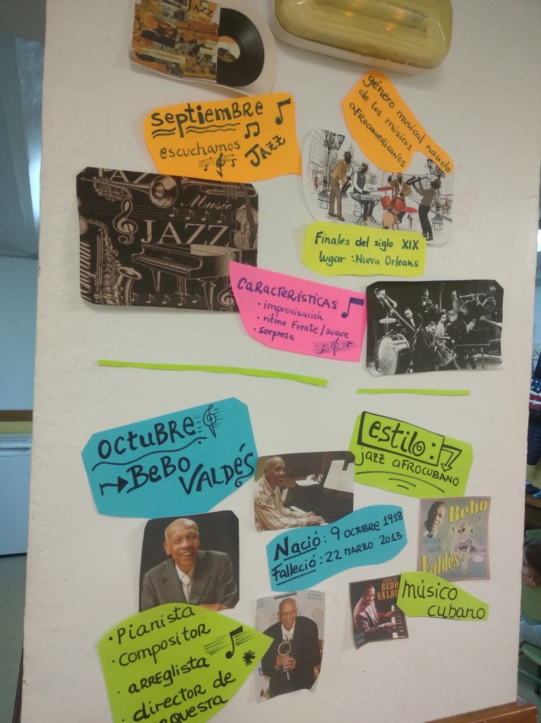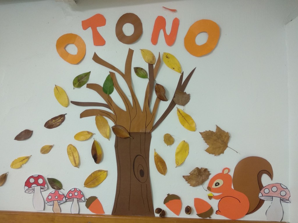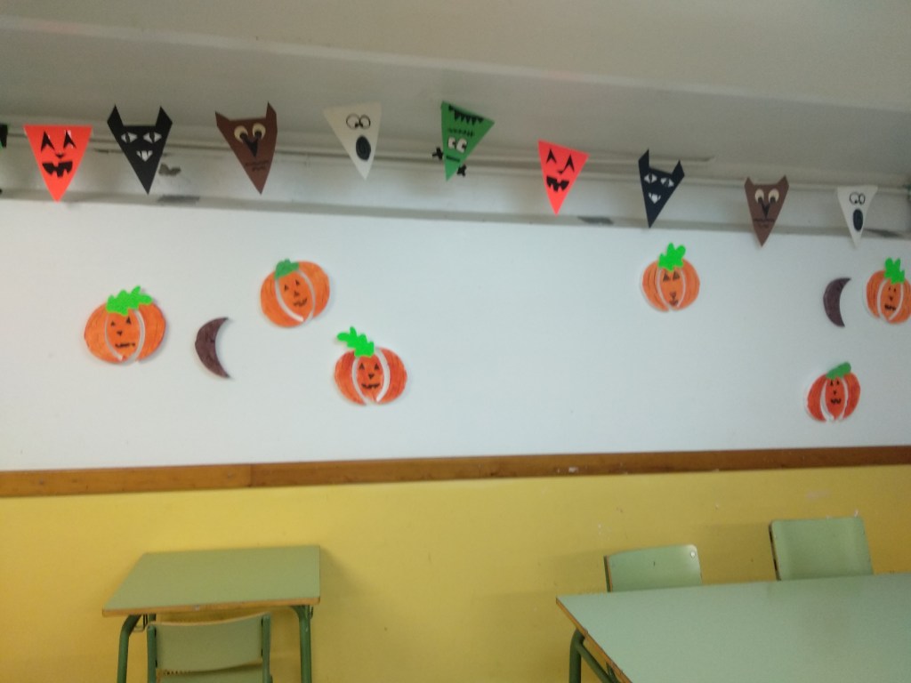 Ya tenemos el espacio acondicionado a nuestras necesidades: en un rincón tenemos fotos de los músicos que amenizan nuestras mañanas, así, elegimos un artista a escuchar mensualmente y colocamos un poquito de información y características del mismo en un espacio de la pared ya destinado para tal fin. En el espacio lateral de la sala hemos decorado distintos ambientes desde septiembre, en primer lugar, fueron las letras de «Madruga» para hacer más nuestro el espacio, después salimos a coger hojas al patio y crear juntos un árbol de otoño, y finalmente está semana hemos colocado la decoración de Halloween que nosotros mismos hemos hecho.