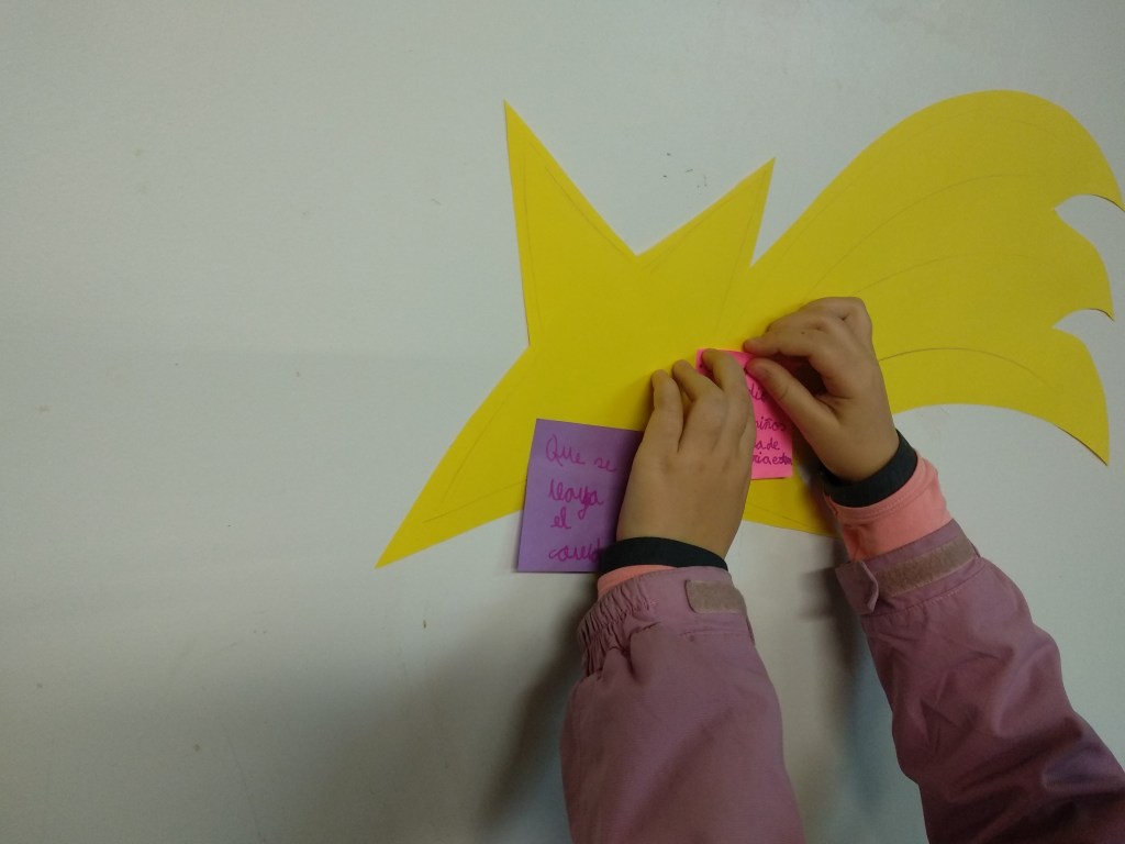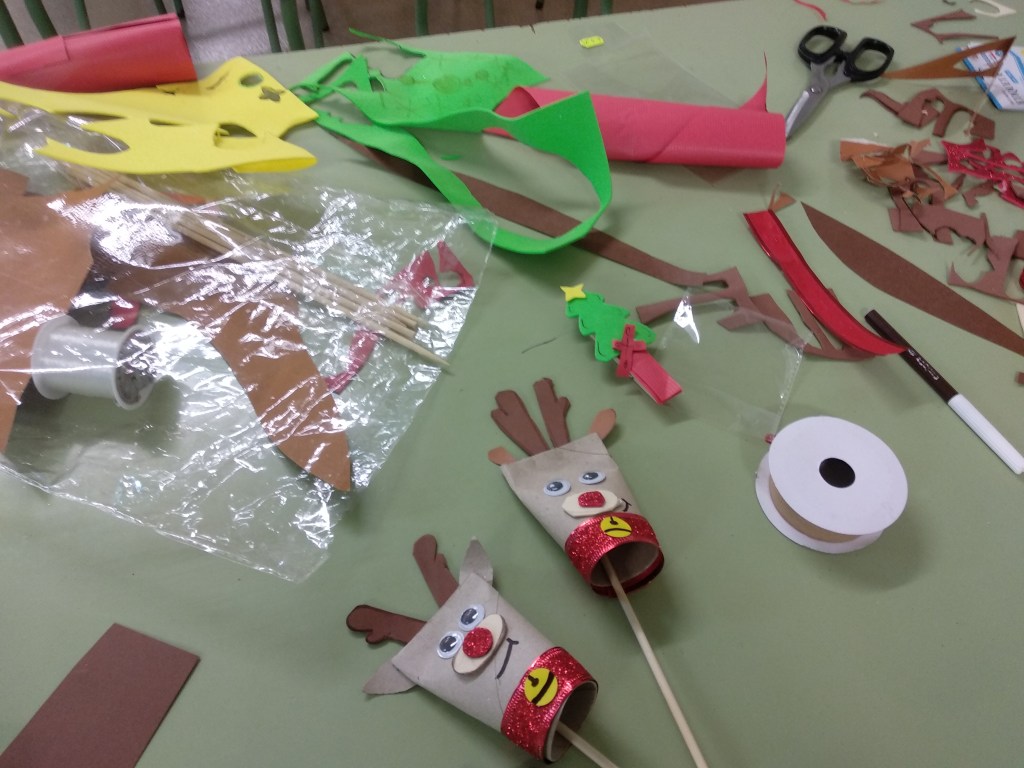Después hemos hecho un mural con un bonito mensaje escrito y un árbol de navidad con bolas pintadas por los más pequeños, también hemos colocado unas estrellas a las que les hemos escrito nuestros deseos, con mucha ilusión ,en unos post-it y además para llevarnos a nuestras casas hemos creado unos renos y unos mini arbolitos de navidad para decorar.