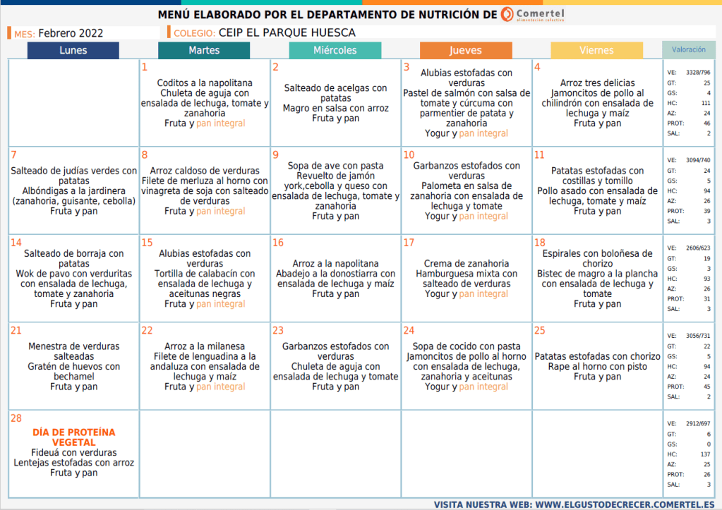 28/01/202228/01/2022 Colegio Público "El Parque" Huesca MENÚ DE FEBRERO Menú de febrero (pdf)Descarga Comparte:Tweet Haz clic para enviar un enlace por correo electrónico a un amigo (Se abre en una ventana nueva) Correo electrónico Haz clic para imprimir (Se abre en una ventana nueva) Imprimir Me gusta Cargando...