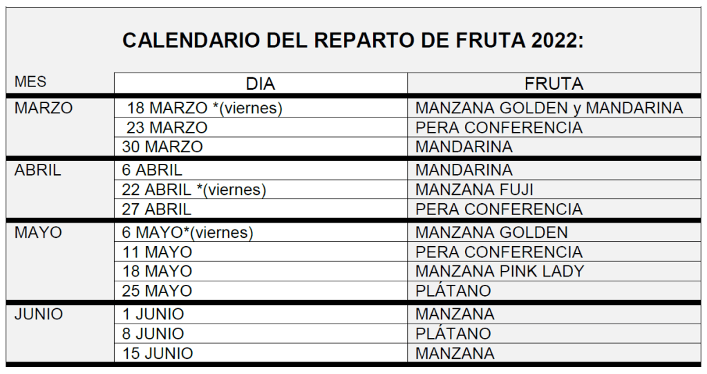 *Las semanas en las que el lunes sea no lectivo se retrasa el reparto, por ello la fruta se consumirá en el almuerzo los viernes.