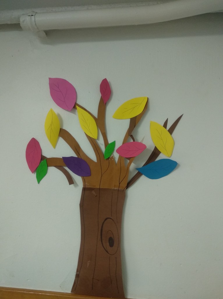 Además, estamos creando unos árboles de colores que van haciéndose cada día más grandes, y añadiendo detalles como arcoíris y nubes a nuestros pequeños rincones primaverales.