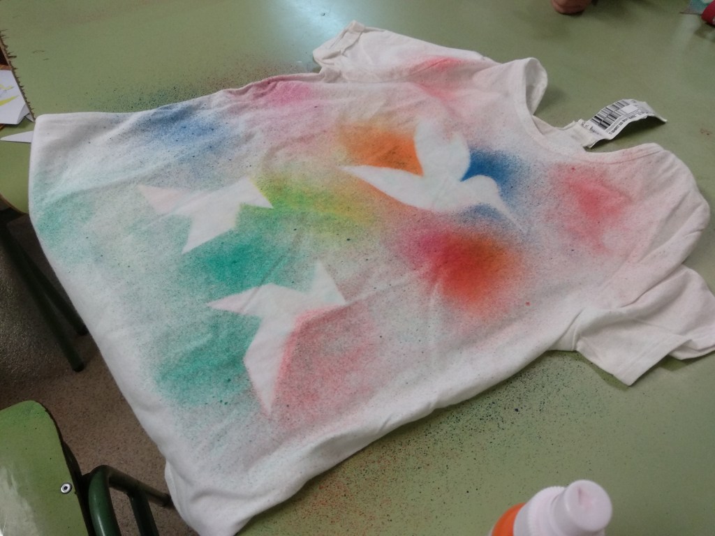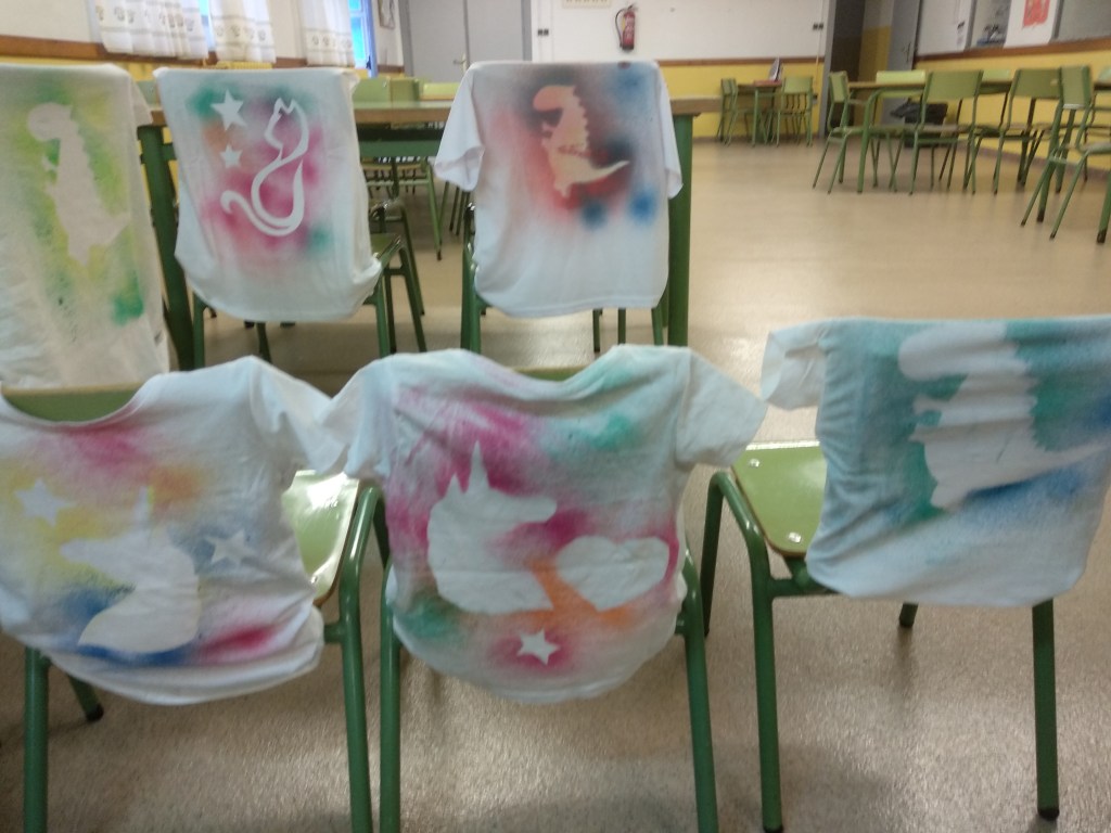 Por otro lado, el mes junio está siendo muy creativo también. Una vez colocada ya nuestra particular «cuenta atrás», nos hemos dedicado a hacernos unas camisetas de colores, pintadas con espray y elaboradas por plantillas de diseños escogidos por nosotr@s mismos, lo estamos pasando en grande.
