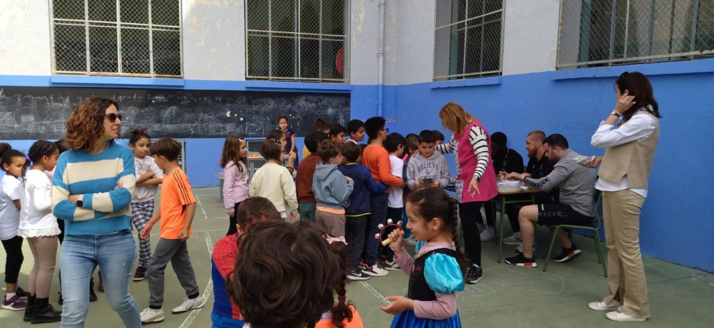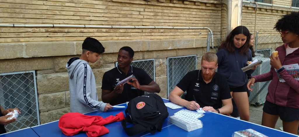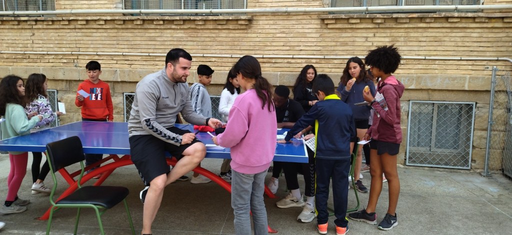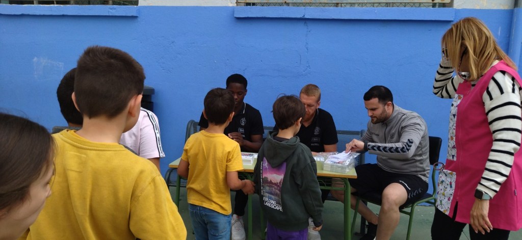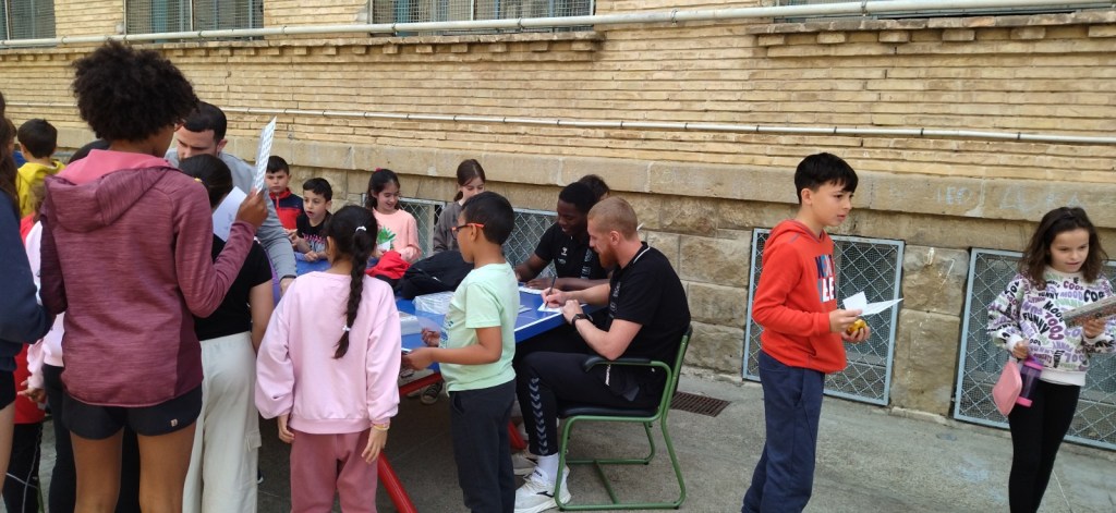 Hoy, en la hora del recreo, hemos recibido la visita de dos jugadores del Bada Huesca (Club Balonmano Huesca). Han firmado autógrafos y han repartido entradas a todo el alumnado de Educación Primaria para el partido del próximo sábado 22 contra el Rebi BM Cuenca.
