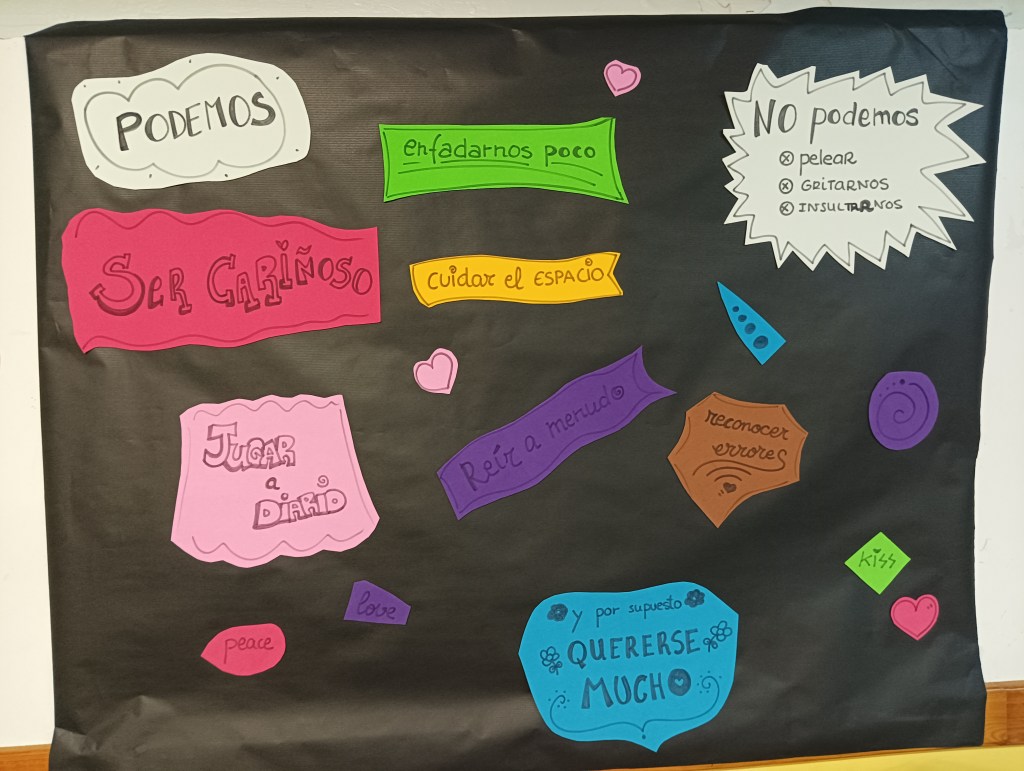 Para empezar, el nuevo curso llegó cargado de algún que otro juego nuevo y, además, comenzamos creando un mural donde plasmamos lo que podemos y no podemos hacer, de forma que durante un tiempo lo vamos leyendo para interiorizar la manera de tratarnos.
