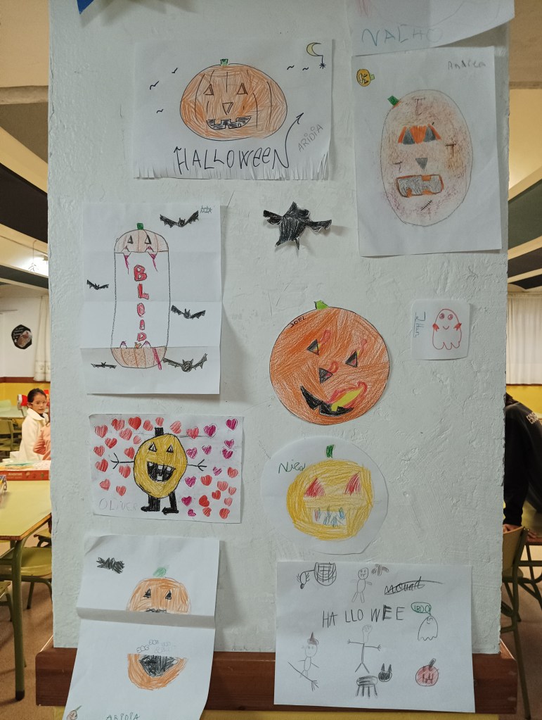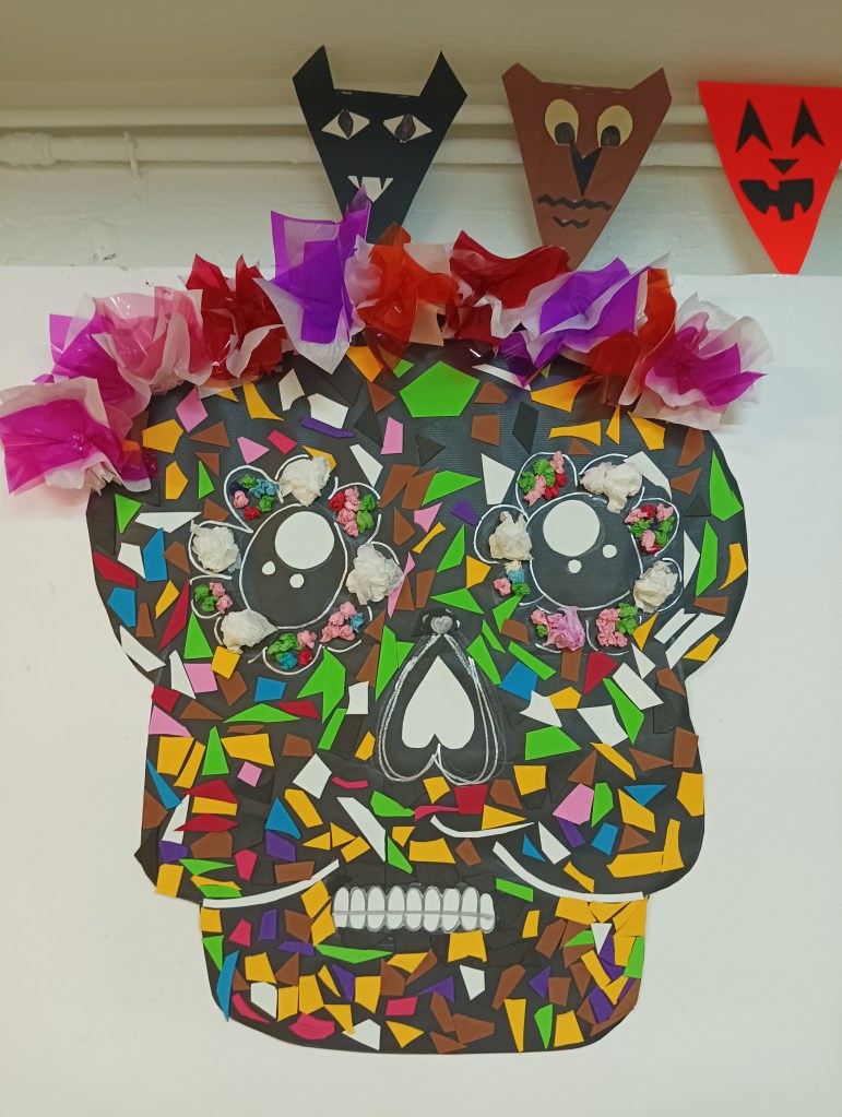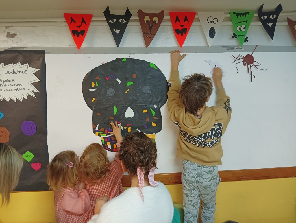 Además, en Halloween, creamos una calavera mosaico con remate floreado hecha a partir de restos del material del año anterior para aprovecharlo y unas letras terroríficas. Usamos la guirnalda típica que teníamos guardada y los niños y niñas hicieron unos dibujos para decorar la pared.