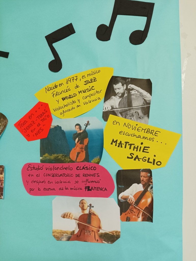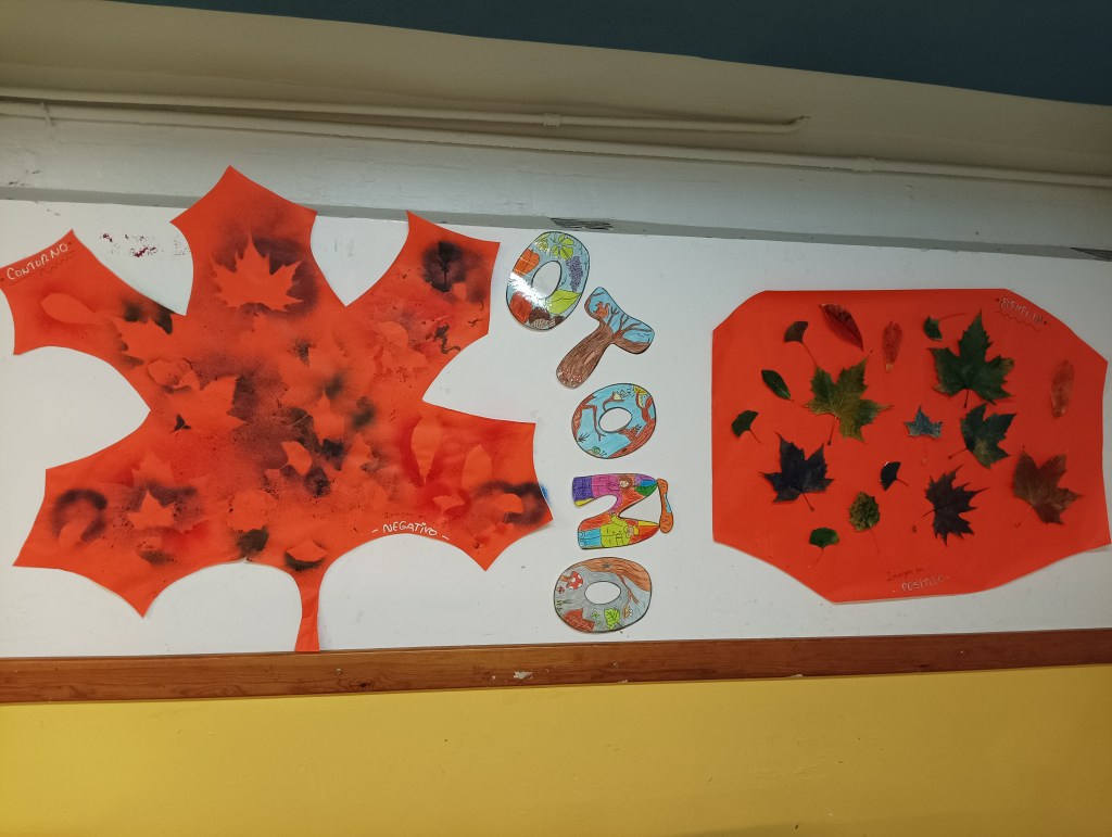 Desde el servicio de madrugadores os contamos que hemos hecho cositas nuevas; entre ellas, hemos decorado el espacio de otoño y, para ello, hemos creado unos murales con distintas técnicas plásticas como la estampación y la pintura en spray. Nos hemos basado en la observación de fondos y contornos de las diferentes hojas de los árboles que tenemos en nuestro jardín botánico de la entrada al patio norte del centro y lo hemos realizado a ritmo del violonchelo de Matthie Saglio.