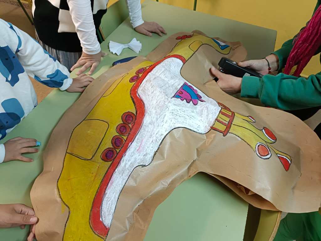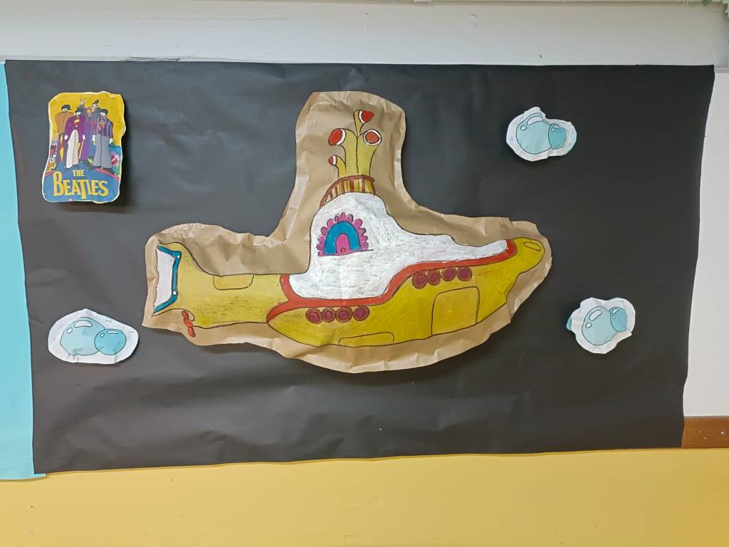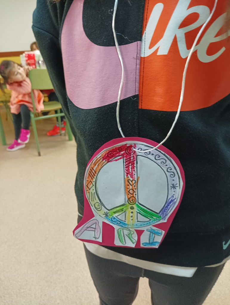 Os mostramos fotos de nuestros colgantes de la paz y de cómo hemos decorado el comedor con nuestro submarino en volumen. Además, la semana de carnaval hemos hecho pintacaras.