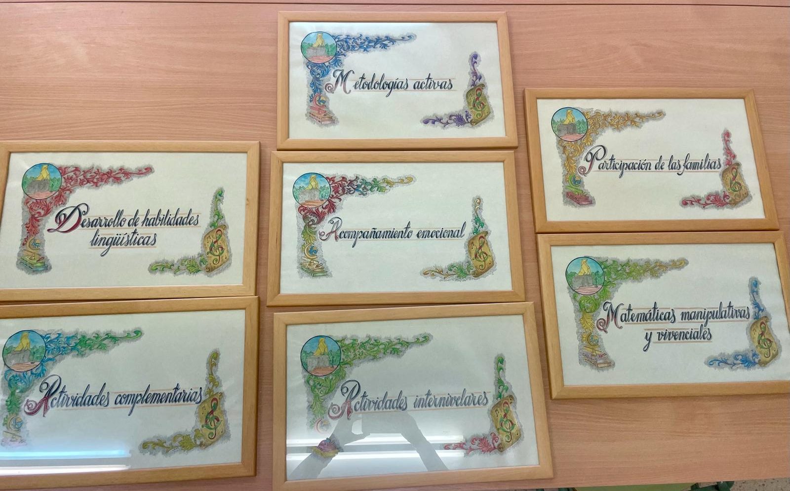 El pasado 21 de febrero, Jesús Castiella Hernández, miembro de la comunidad educativa por su vínculo familiar con una alumna y una maestra del centro, ha hecho entrega de unos rótulos ilustrados que recogen los 7 pilares fundamentales en los que se asienta nuestro proyecto educativo de centro. Su gran trabajo ha sido entregado altruistamente por el artista y recogido con cariño por el Equipo Directivo. La obra elaborada de manera totalmente artesanal con plumilla y acuarela, decorará el pasillo de entrada al centro.
