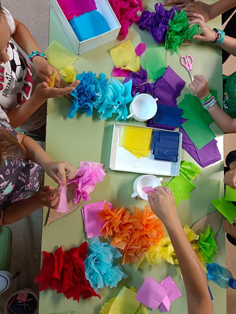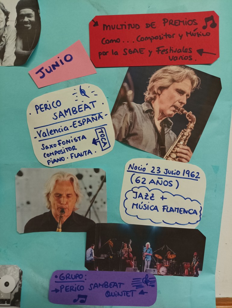 Y este mes de junio hemos terminado el mural de primavera con una gran flor hecha de papel de seda. Les ha gustado mucho ver cómo iba cogiendo volumen y ganaba en colorido, mientras escuchaban de fondo a Perico Sambeat.
