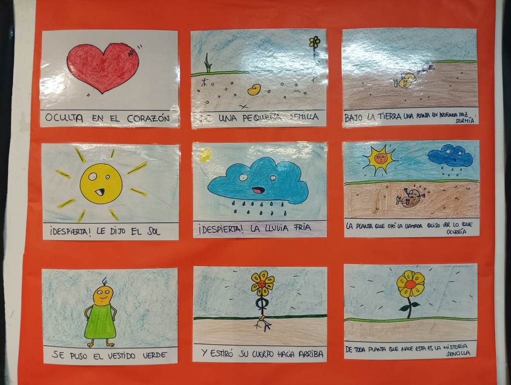 Durante el mes de mayo estuvimos recitando la poesía de la semilla y juntos elaboramos un mural con las distintas imágenes de la poseía, quedó muy bonito. Lo hicimos escuchando a Aretha Franklin.