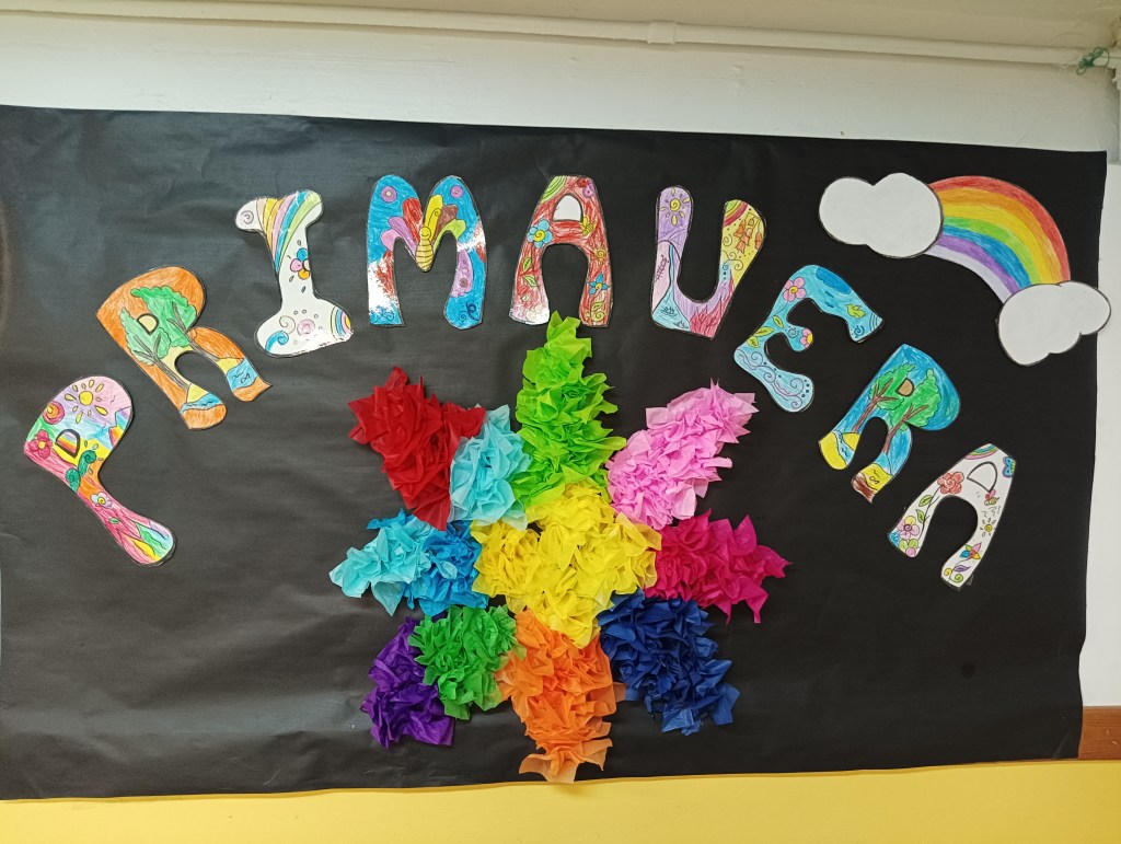 En abril creamos un mural con las letras de primavera, que pintaron entre todos y todas a ritmo de Rita Payés.