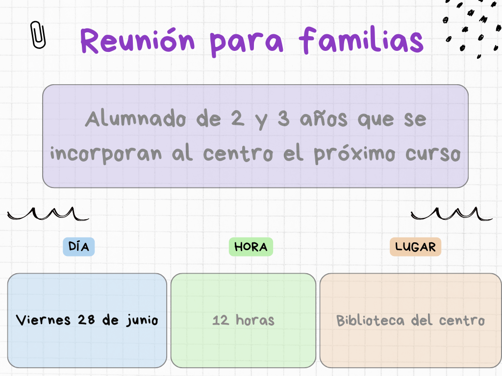 El viernes 28 de junio a las 12 horas en la biblioteca del centro tendrá lugar una reunión para las familias del alumnado que el próximo curso escolar se incorpora a nuestro centro (2 y 3 años).