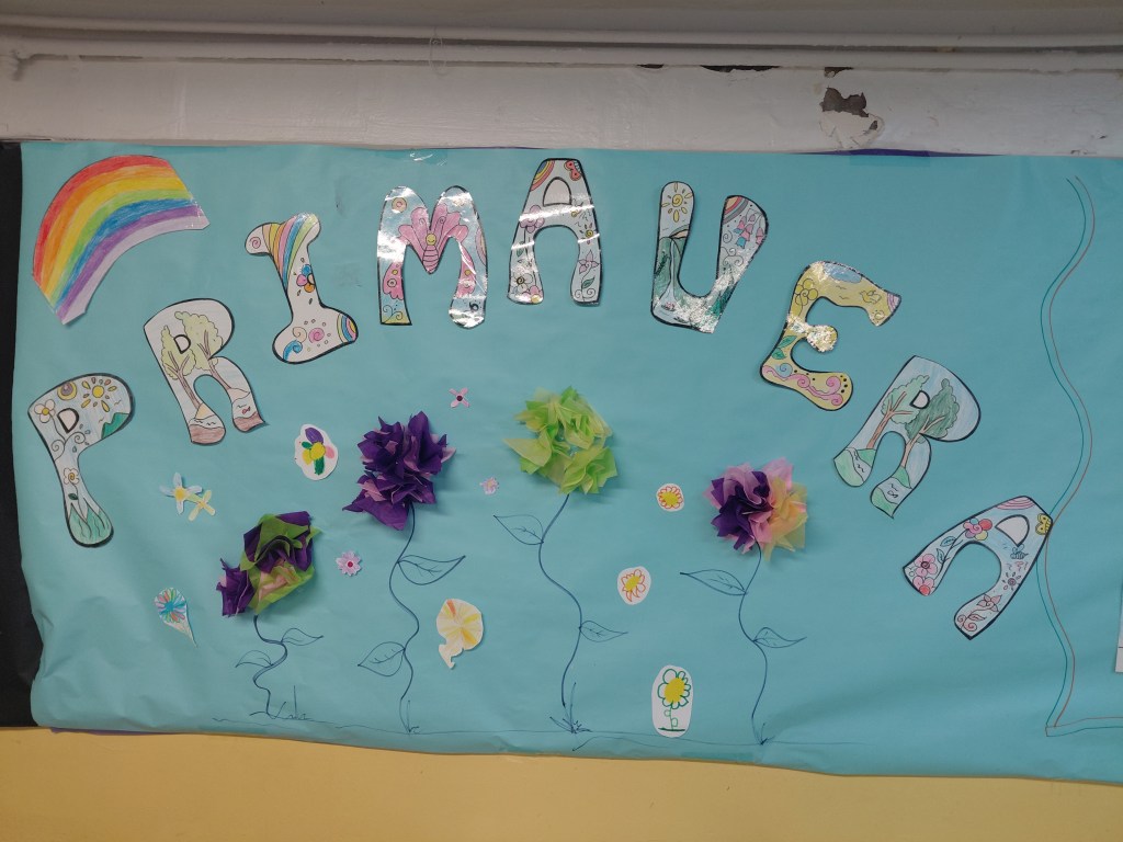 Después hemos hecho un mural de primavera con letras decorativas y flores de seda.