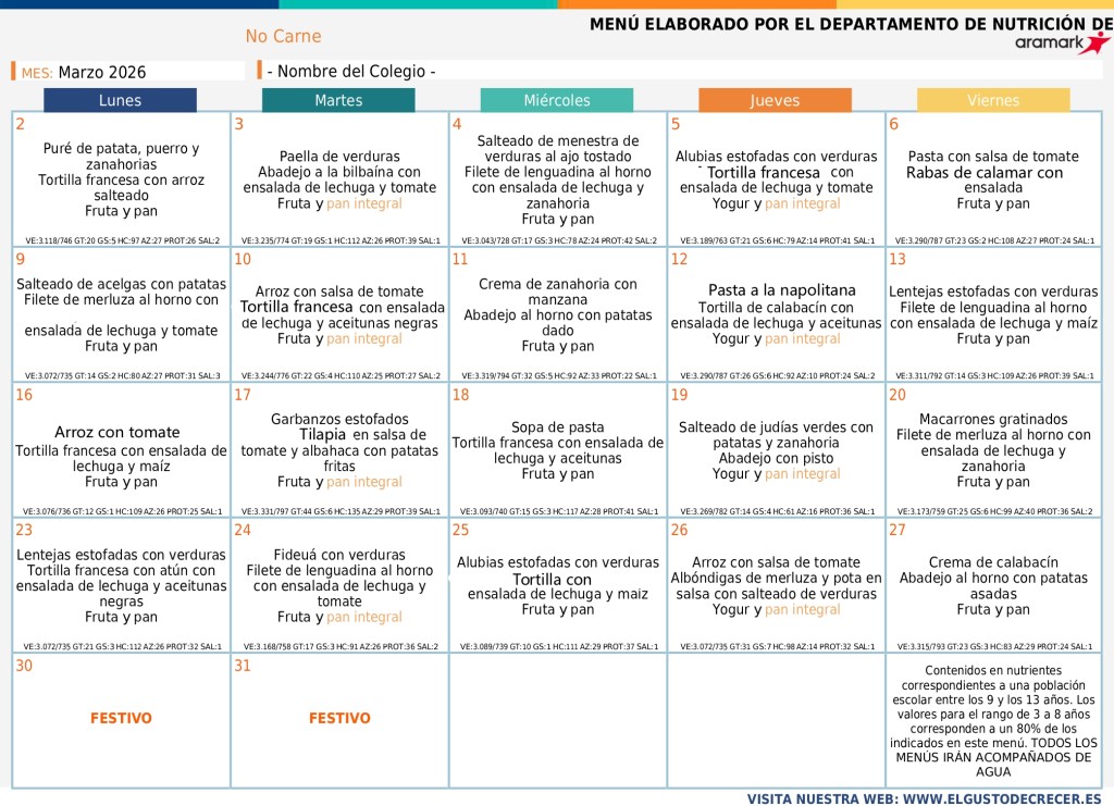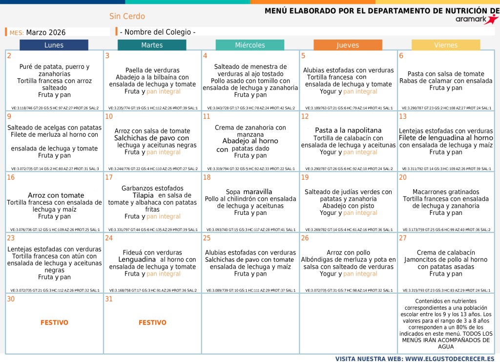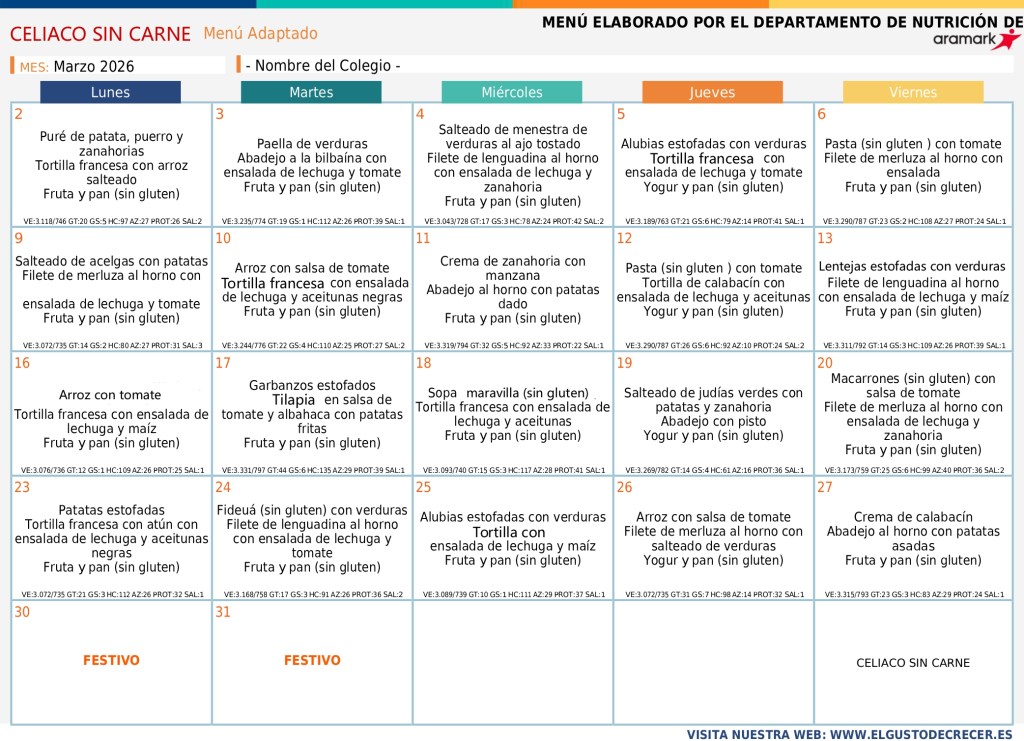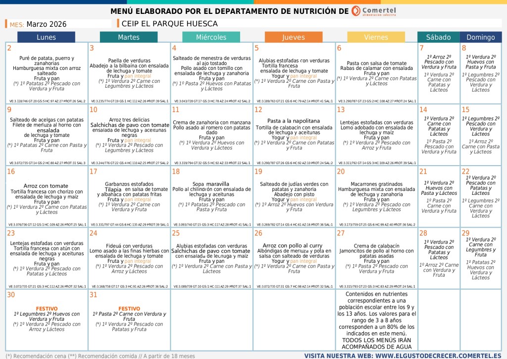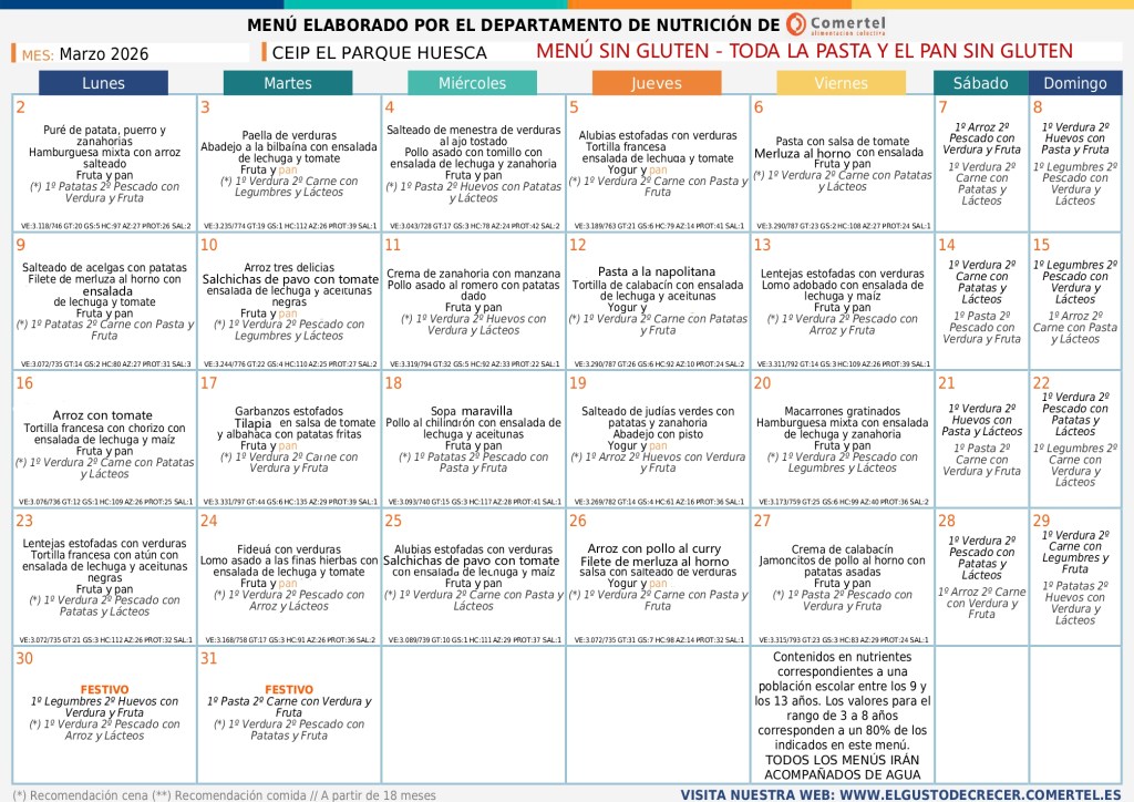 28/02/2026 Colegio Público "El Parque" Huesca MENÚ MARZO MENÚ BASAL ↓ SIN GLUTEN ↓ CELIACO SIN CARNE ↓ SIN CARNE ↓ SIN CERDO ↓ Comparte:Tweet Enviar un enlace a un amigo por correo electrónico (Se abre en una ventana nueva) Correo electrónico Imprimir (Se abre en una ventana nueva) Imprimir Me gusta Cargando...